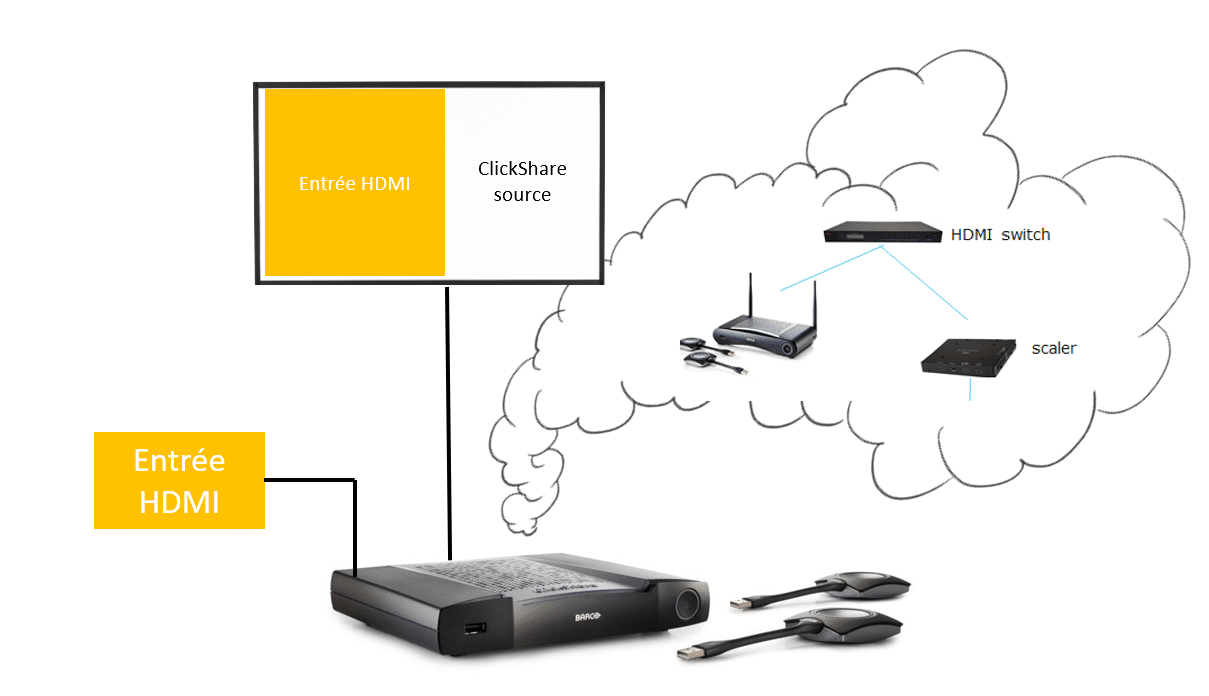 Mais au cas où, on le fait quand même :) ClickShare, c’est un système de présentation sans fil. Et comme son nom l’indique, il vous permet de diffuser du contenu sans avoir besoin de ce fameux câble HDMI (ou autre). Ordinateur portable, tablette, smartphone… Vous pouvez partager n’importe quel contenu depuis l’appareil de votre choix. Et tout ça en un seul clic (ou presque) ! Il vous suffit de brancher le bouton ClickShare au port USB de votre ordinateur, lancez l’application et cliquez sur le bouton. Votre ordinateur s’affiche à l’écran ! https://www.youtube.com/embed/JRgSKGC6Gk8Une gamme plus complète avec le CS-100 Huddle et le CSE-200+