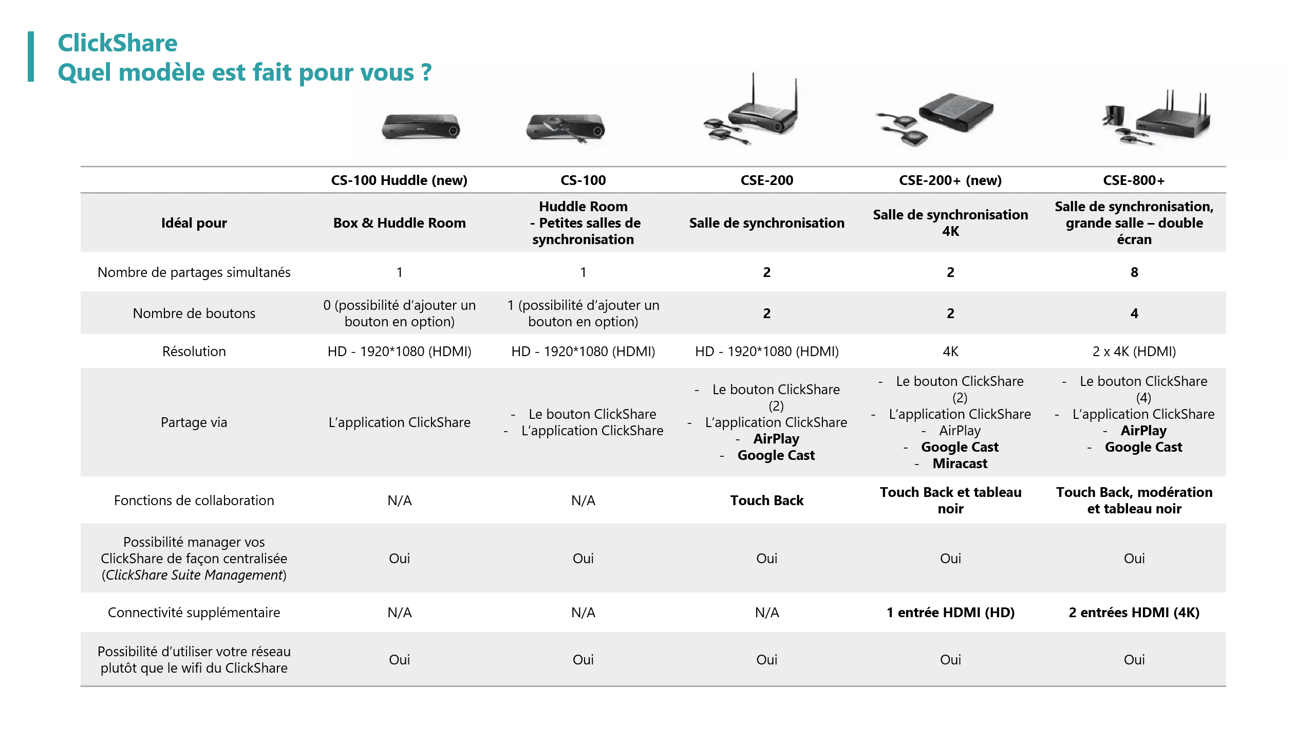 Avec l'arrivée des nouveaux boîtiers ClickShare CS-100 Huddle et CSE-200+, vous allez forcément trouver votre bonheur ! Pour vous faciliter la tâche, nous vous avons préparé un petit tableau tableau comparatif, histoire de trouver le ClickShare de vos rêves* en 2 minutes Top chrono, et on vous en dit plus sur les deux nouveautés juste en dessous. Alors, quel modèle de Clickshare est fait pour vous ?