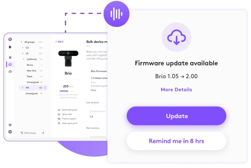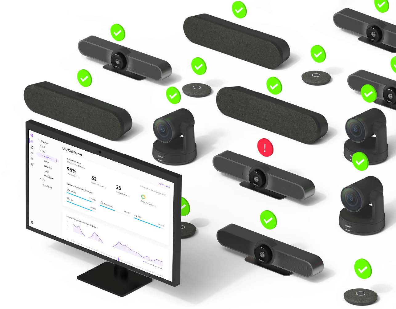 Sur cette capture de Logitech Sync, vous pouvez observer un écran présentant les différents équipements dans votre entreprise. Partout dans le monde.