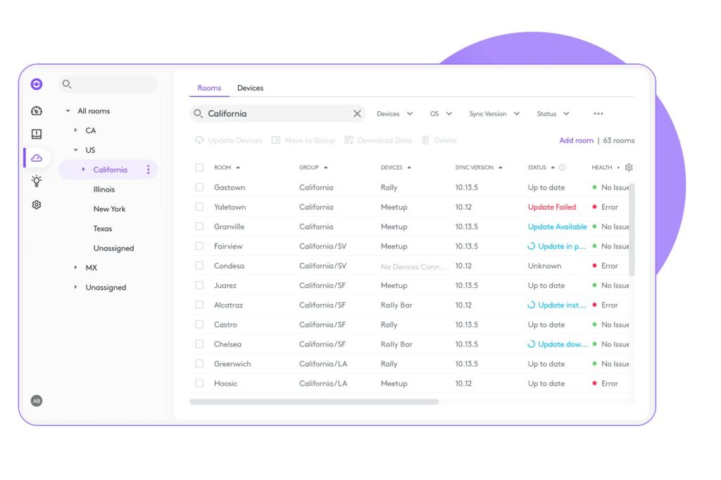 Le but premier de ce portail, c’est de gérer une quantité importante d’appareils, en quelques clics. En tant qu’administrateur vous pouvez donc visionner en un coup d’œil le statut de toutes les salles enregistrées dans le logiciel. Cette interface de gestion comprend trois fonctions principales :- Surveiller vos appareils : Vous pouvez rapidement checker l’état de vos appareils. Si une salle apparait hors ligne, ou si un appareil est manquant dans votre espace connecté, c'est visible !