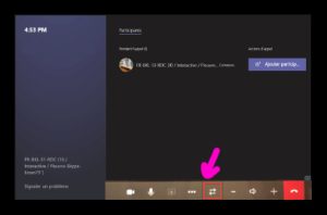 Comme il s'agit d'un système à double écran, une nouvelle icône apparaît sur la barre d'outils de la tablette tactile de la salle de réunion. Ce bouton avec deux flèches permet de basculer les affichages si vous souhaitez que la visio ou le contenu apparaisse de l'autre côté. Il disparaît une fois l'appel terminé.