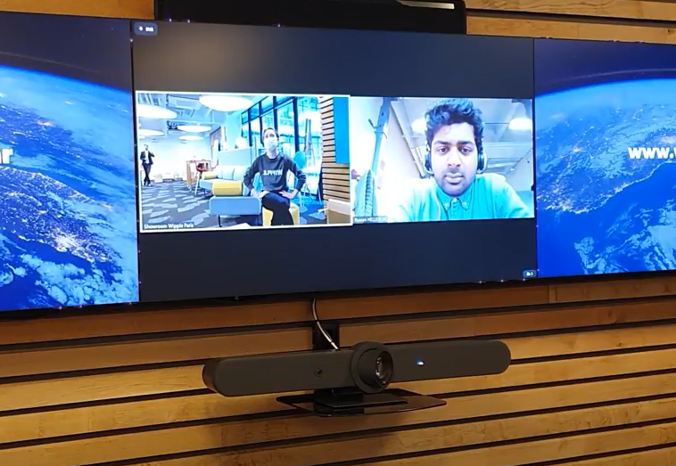 Dans cette section, nous avons testé comment se comporte la caméra pendant une réunion. Nous avons effectué des tests dans notre showroom parisien avec deux personnes sur site et une personne à distance. Il convient de noter qu'il s'agit ici de conditions optimales de tests. Nous ne sommes que deux alors que dans une salle de réunion de taille moyenne, le nombre de participants est plus élevé et les interactions / déplacements sont plus nombreux. Néanmoins, ce test donne une bonne indication sur les performances de cadrage ou framing de la caméra Logitech Rally Bar.Dans une petite salle de réunion avec recul inférieur à 3 mètres