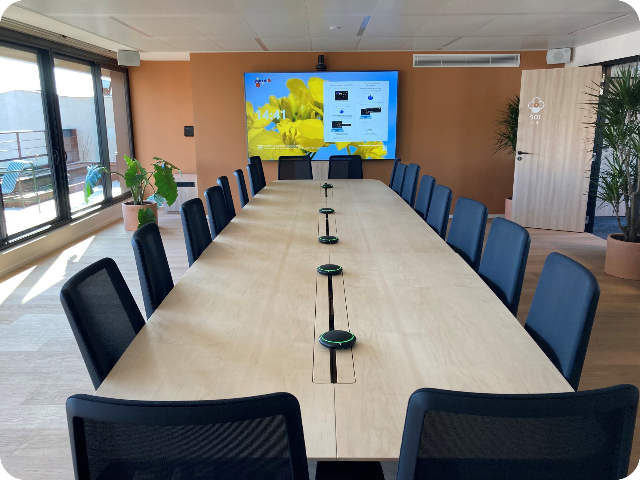L’objectif était de créer un environnement de travail collaboratif, capable de faciliter les réunions internes et externes tout en offrant une expérience utilisateur intuitive et performante, avec la possibilité de partager du contenu sans fil depuis un ordinateur et d’utiliser des micros d’extension.