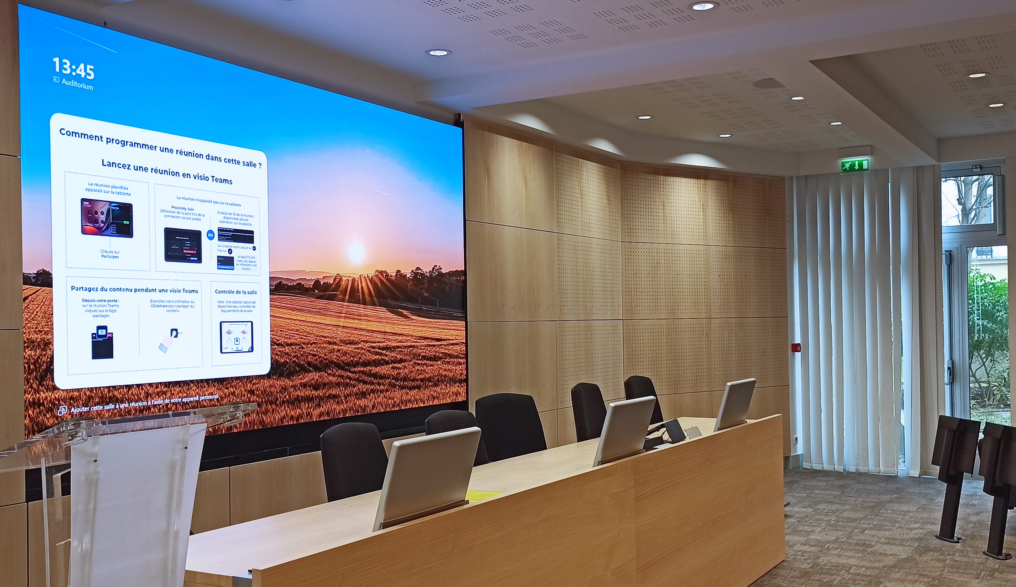 Un auditorium de 80 places nécessitait une transformation complète pour devenir une salle de réunion moderne et technologiquement avancée, intégrant la solution Microsoft Teams Room.